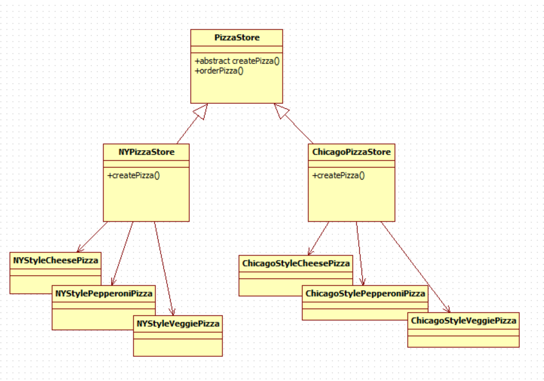 그리고 PizzaStore를 상속받은 NYPizzaStore과 ChicagoPizzaStore에서 createPizza()메소드를 구현하며, 직접 필요한 객체를 생성한다. ->서브클래스에서 어떤 객체를 생성할지 결정한다.
