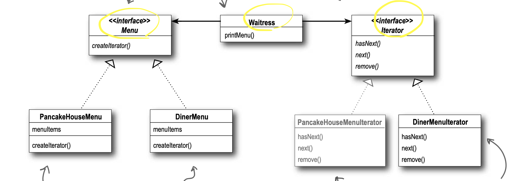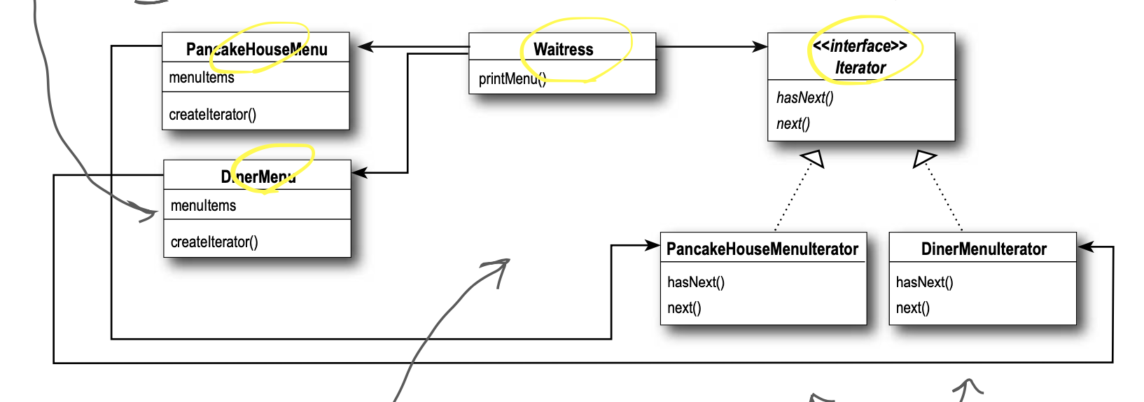 따라서 통합된 인터페이스를 제공하여 웨이트리스 클래스(클라이언트)가 동일한 방식으로 각 아이템에 접근할 수 있게 해주기 위해 이터레이터 패턴을 적용하여 보자.