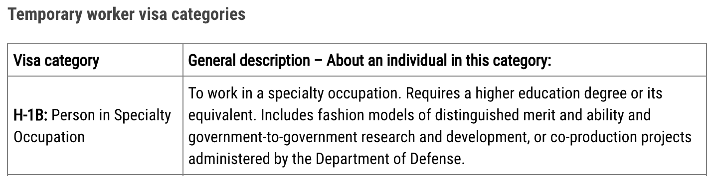 H-1B 전문 직업에는 건축, 공학, 수학, 물리 과학, 사회 과학, 의학 및 건강, 교육, 비즈니스 전문, 회계, 법학, 신학 및 예술과 같은 분야가 포함될 수 있다.