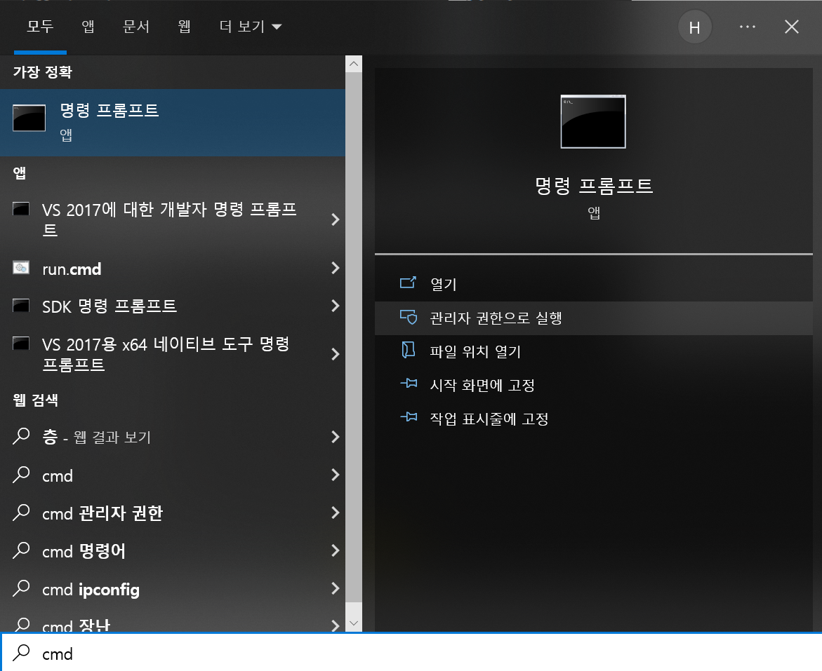1) cmd 관리자 권한으로 실행